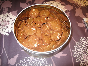Ingers Brune kager50 g. smuttede mandler hakkes 125 g (1 dl) Mørk sirup 2 tsk. Potaske Når massen er håndvarm, men ikke før Tilsættes 250 g. mel, Det hele røres i røremaskinen og blandes godt. Rulles i pølser og skal stå i 2 dage. Kan lægges i fryseren. Men avisen skrev at dejgen var ikke fryseegnet. Bages ved 160 i fra 5-10 min- |
