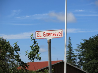 Vort første mål var Hømlund tyske toldsted, som ses her ovenfor. Vi kørte ad små veje og et sted stod der pludselig Gl Grænsevej. En venlig mand oplyste os om, at grænsen gik lige oppe ved et levende hegn, som vi fotograferede