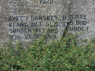 Næste stop gjorde vi, da vi havde passeret Årup Hede i Harreby. De havde indrettet en mindeplads i glæde over genforeningen 1920. Der havde de sat 4 grænsesten med tekst fra nr 28-31. Der var i alt 128 grænsesten fra nr 1 i vest til 128 i øst. Desuden havde de på minestenen sat denne tekst: